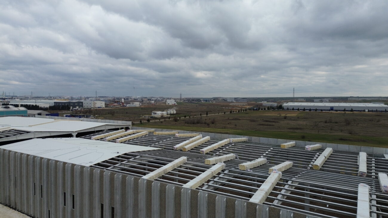 Yeni yılla birlikte projemizde önemli bir aşamaya geçildi. Üretim alanının çatı kaplama uygulamaları titizlikle başlatıldı. Hava koşullarına dayanıklı, yüksek yalıtım performansına sahip modern çatı sistemleriyle yapının üst örtüsü güvence altına alınmaktadır. Aynı zamanda saha genelindeki diğer tamamlayıcı imalatlara da eş zamanlı olarak devam edilmektedir.